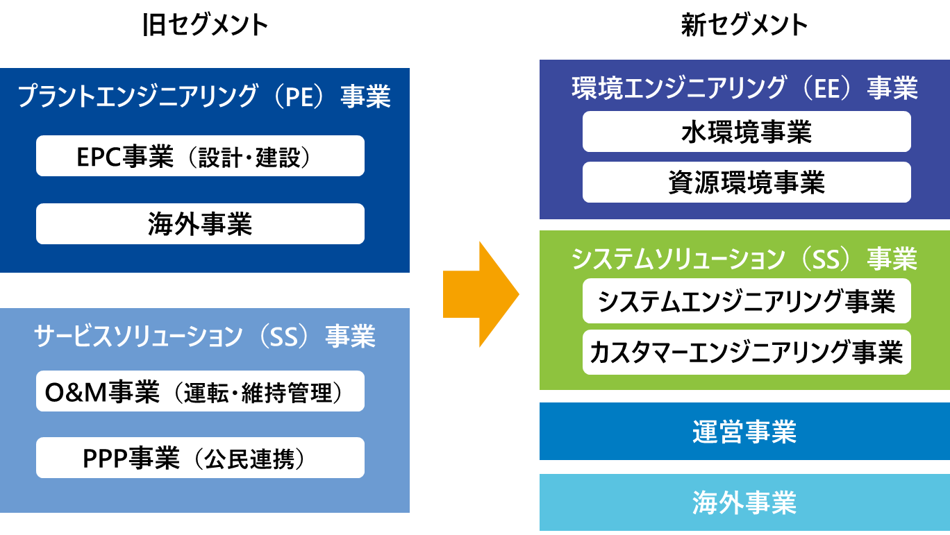 従来の2区分(プラントエンジニアリング事業、サービスソリューション事業)から、4区分(環境エンジニアリング事業、システムソリューション事業、運営事業、海外事業)に変更します。