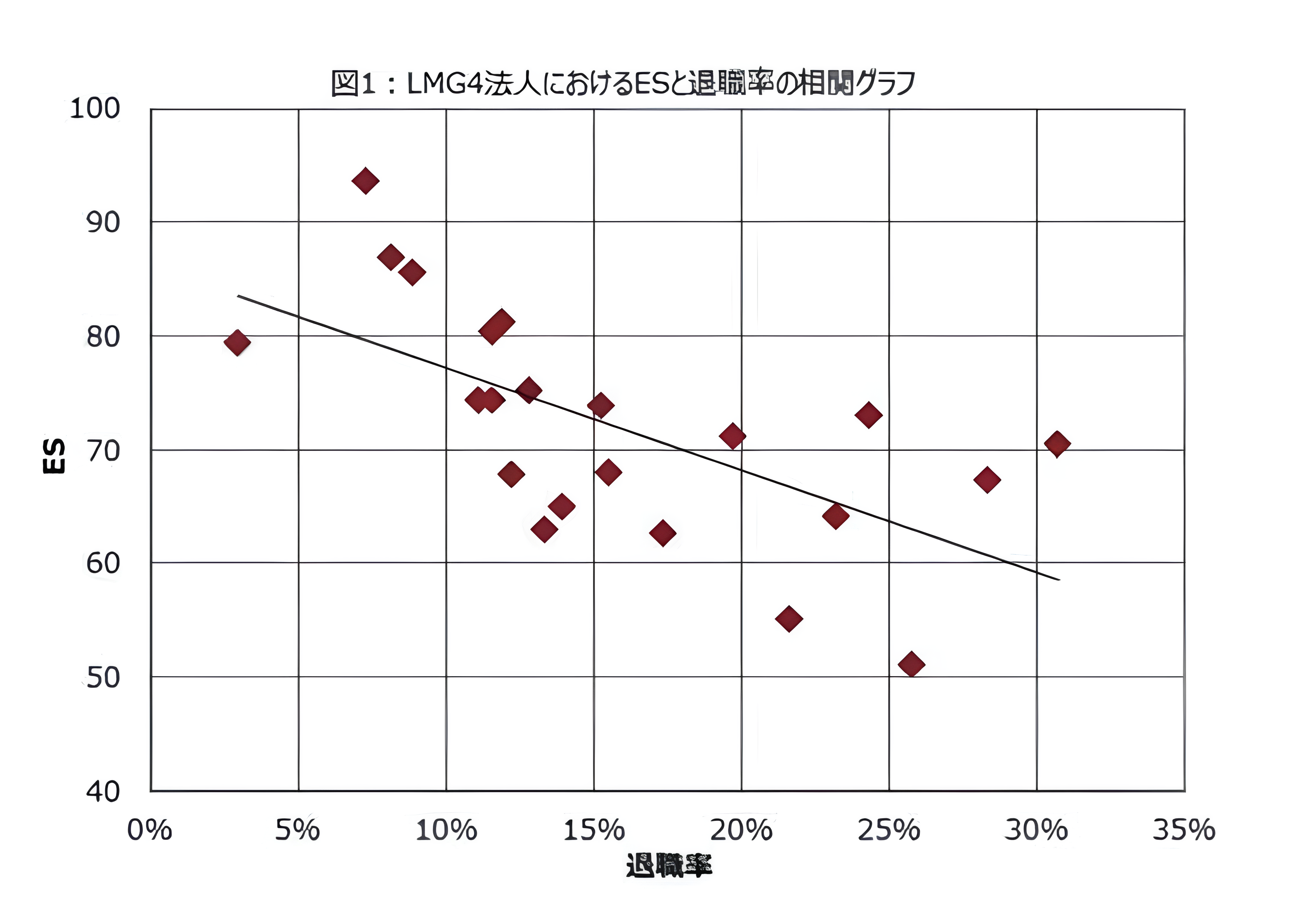 株式会社リンクアンドモチベーションの『「エンゲージメントと退職率の関係」に関する研究結果』によると、ES(エンゲージメントスコア)と退職率の間には負の相関が見られ、エンゲージメントが高い組織ほど退職率が低い傾向が示されています。