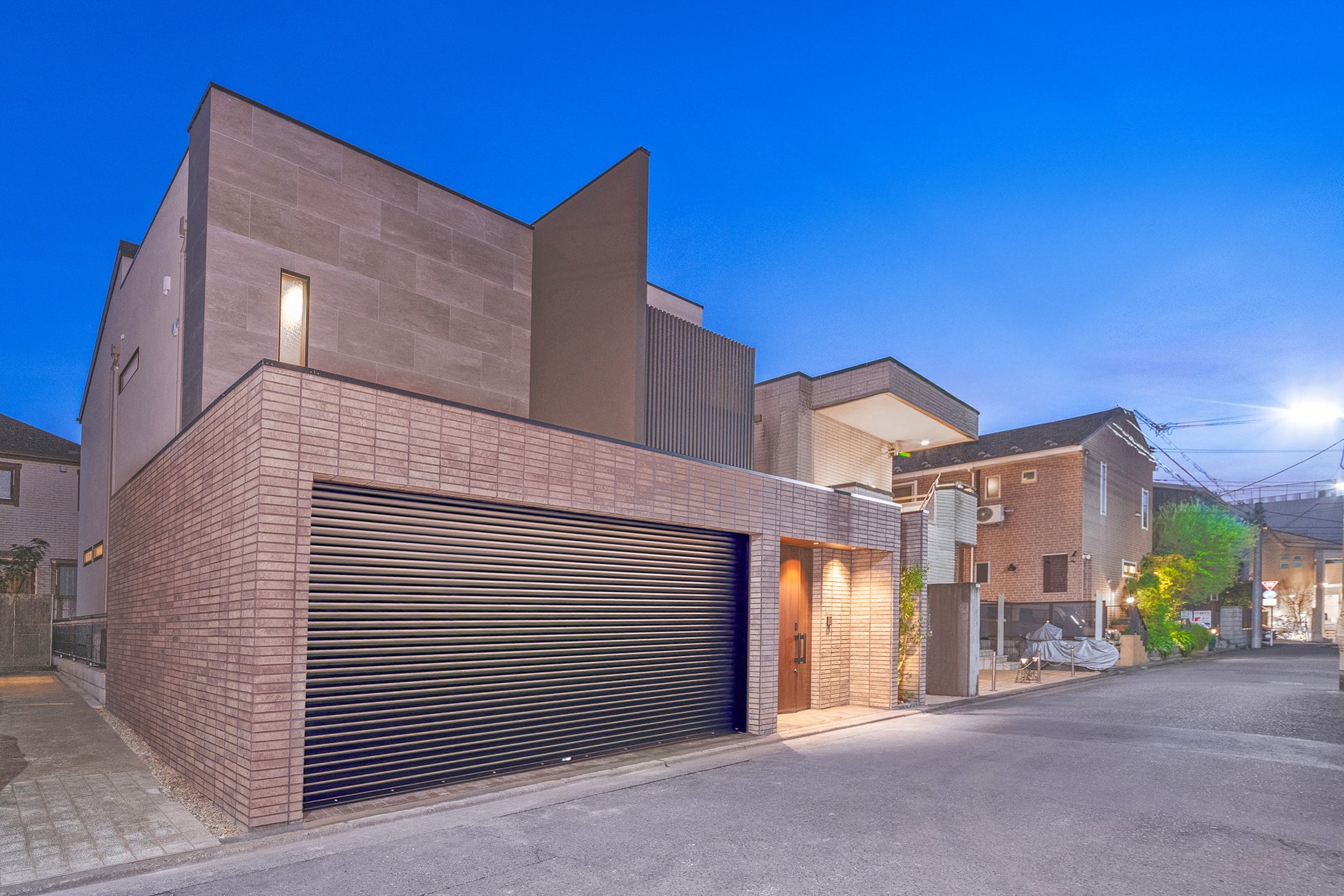 フラグシップモデルにふさわしい外構・ファサードデザインを追求。2台並列で利用できるシャッターゲートに門扉を組み合わせ、セキュリティとプライバシー性能を大幅に向上。