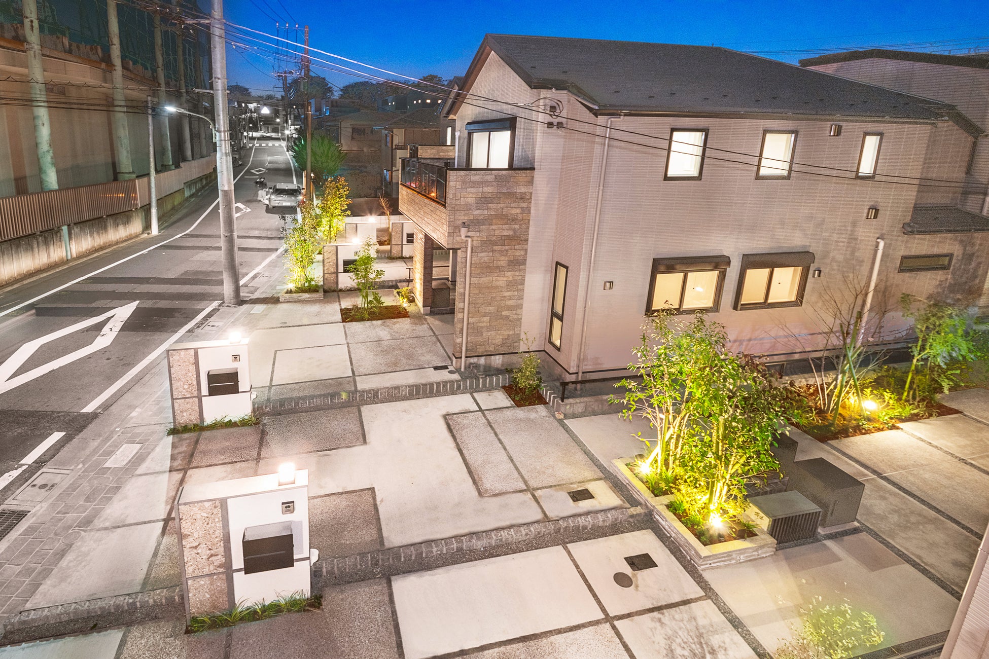 ペイブを連続させた外構と、門柱を道路に直角配置する設計により、敷地内のゆとりとセキュリティを両立しました。外観・内装は奥と手前で2種類を設定。手前区画は切妻屋根で将来の太陽光設置に配慮し、バルコニーや袖壁など安全性と意匠性を向上。内装は手前をダーク系で上質に、奥は明るい色調で開放感を演出しています。