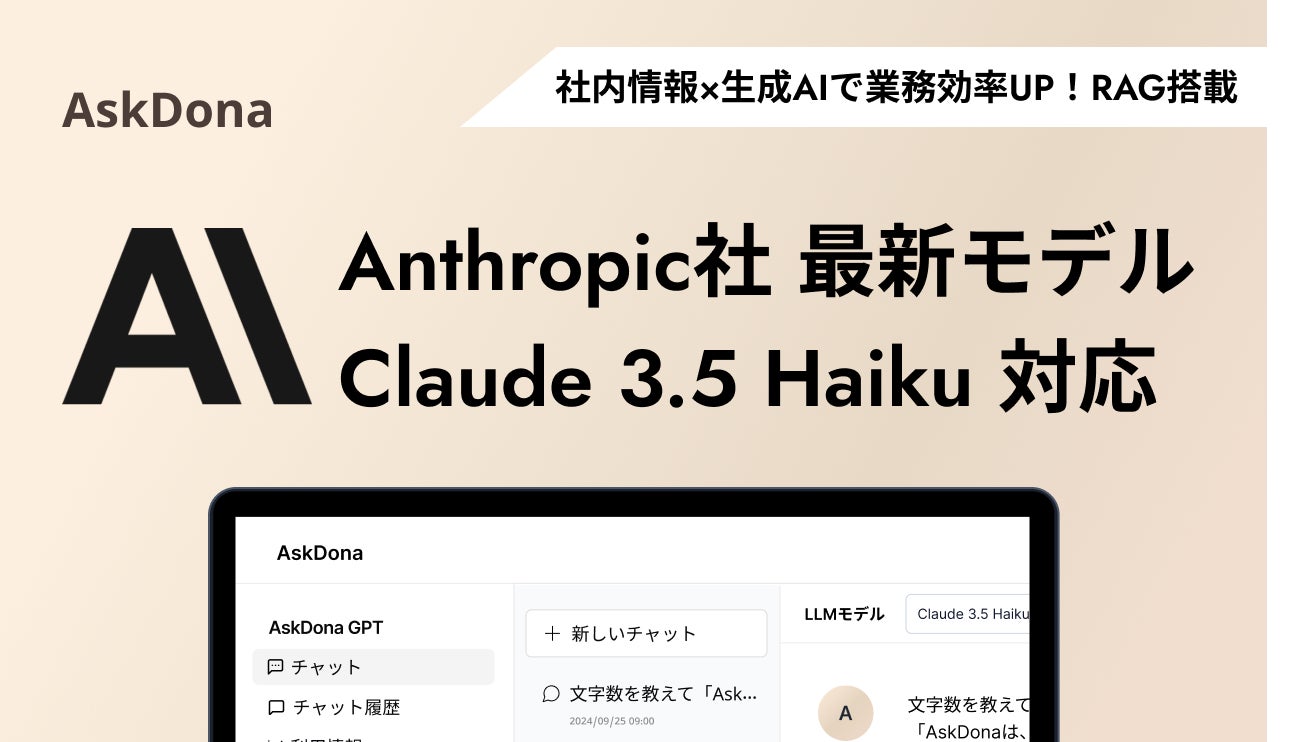法人向け生成AIプラットフォームAskDona、Claude 3.5 Haikuに対応!