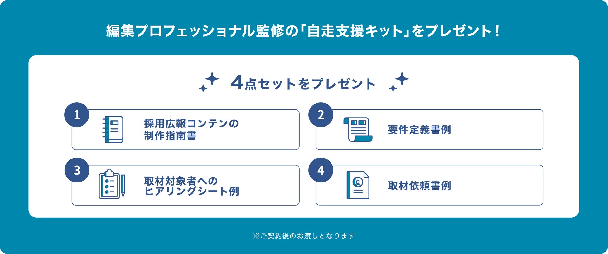 「StoryHub for 採用広報」をご契約者の方限定で、編集プロフェッショナル監修の「自走支援キット」(「採用広報コンテンツの制作指南書」「要件定義書例」「取材対象者へのヒアリングシート例」「取材依頼書例」)をプレゼント。取材依頼から記事の制作までの内製化をサポートします。