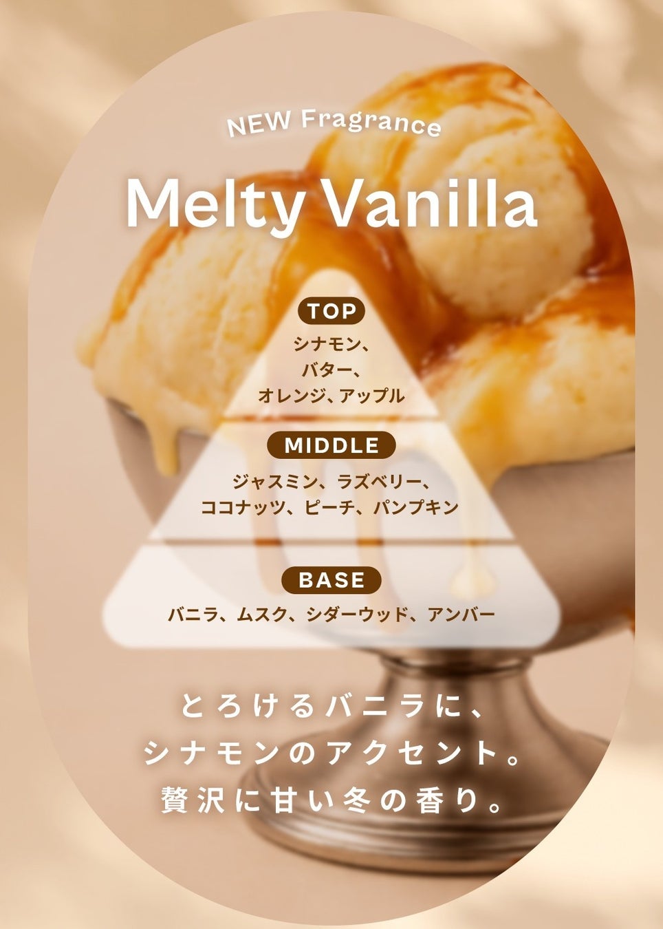 「メルティバニラ」は、冬に寄り添うやわらかな甘さをまとった限定香料です。