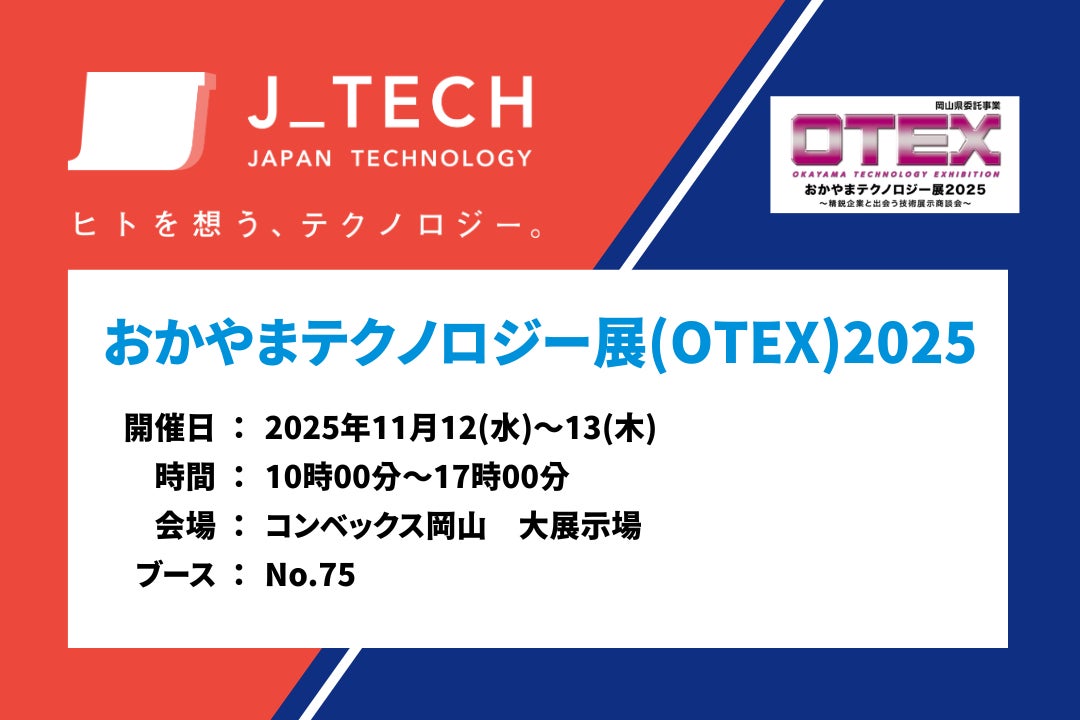 ソフトウェアを通して様々な情報サービス事業を展開する株式会社ジェイテック(以下「ジェイテック」)は、11月12日(水)~13日(木)にコンベックス岡山で開催される、大規模展示商談会「おかやまテクノロジー展(OTEX)2025」に出展いたします。