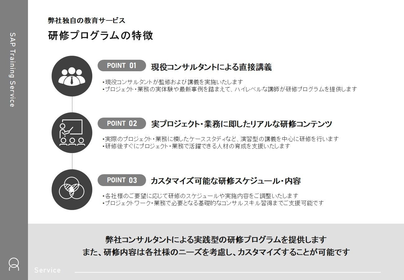 弊社では、SAP領域に特化した法人向け研修サービスを展開しております。経験豊富な現役SAPコンサルタントが講師を務め、プロジェクト現場で即戦力として活躍できる人材の育成をサポートします。研修内容は、各企業様の導入済みシステムや業務課題、目標に合わせて柔軟にカスタマイズ可能です。