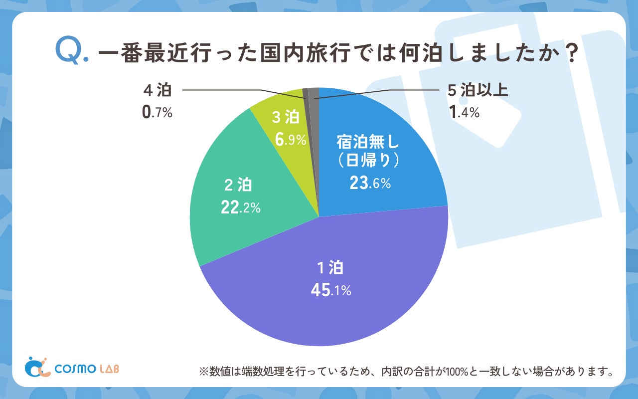 滞在日数は「1泊」が45.1%と最も多く、「宿泊無し(日帰り)」が23.6%、「2泊」が22.2%と続いています。3泊以上の長期滞在は少数派であり、シニア層の国内旅行は短期間で完結するスタイルが主流となっています。