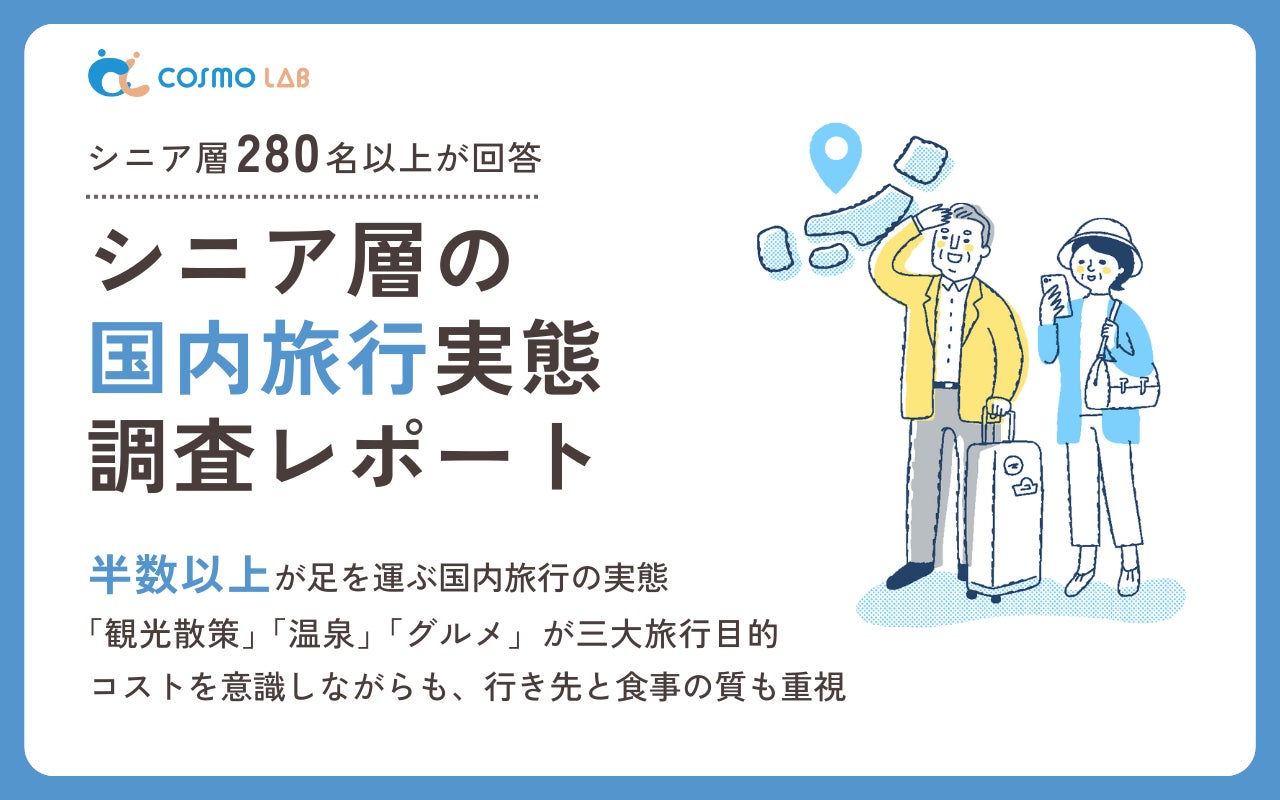 シニア専門の調査プラットホーム コスモラボ(会社名:コスモヘルス株式会社、本社:東京都港区、代表取締役社長 小塚 崇史)が国内旅行に関する市場調査・アンケートリサーチのレポートをリリースしました。