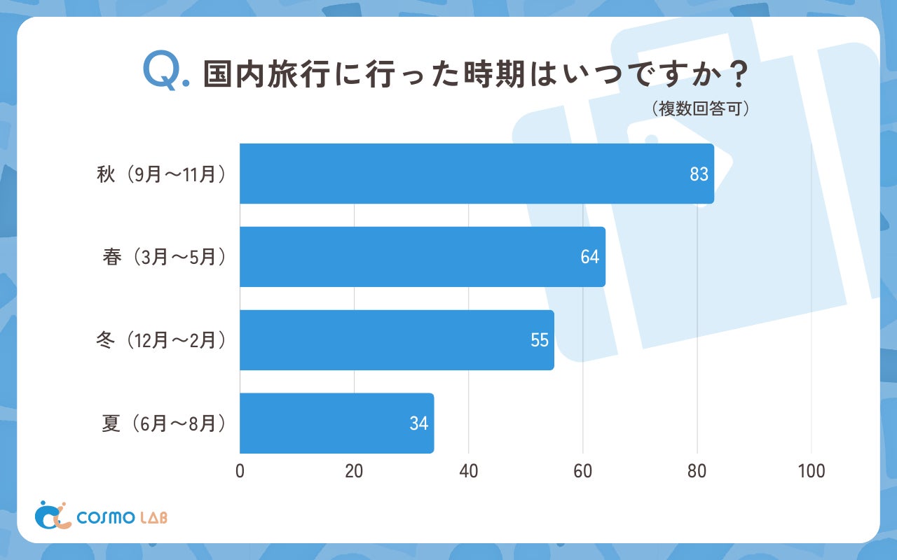 旅行時期は「秋(9月〜11月)」が57.6%と最も多く、次いで「春(3月〜5月)」が44.4%、「冬(12月〜2月)」が38.2%、「夏(6月〜8月)」が23.6%となっています。秋と春に旅行が集中する背景には、気候の良さに加え、紅葉や桜などの季節の魅力、混雑を避けたいという意向が考えられます。