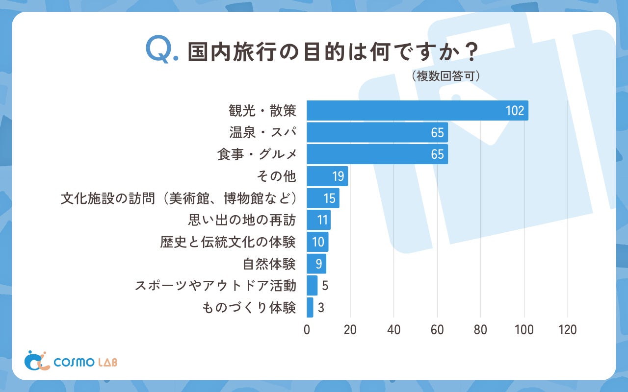 国内旅行の目的では「観光・散策」が70.8%と圧倒的に高く、「温泉・スパ」と「食事・グルメ」がともに45.1%で続いています。この結果からは、名所旧跡や景勝地を訪れる観光が主目的でありながら、温泉でのリラックスや地元の食を楽しむことも重要な旅の要素となっていることが分かります。