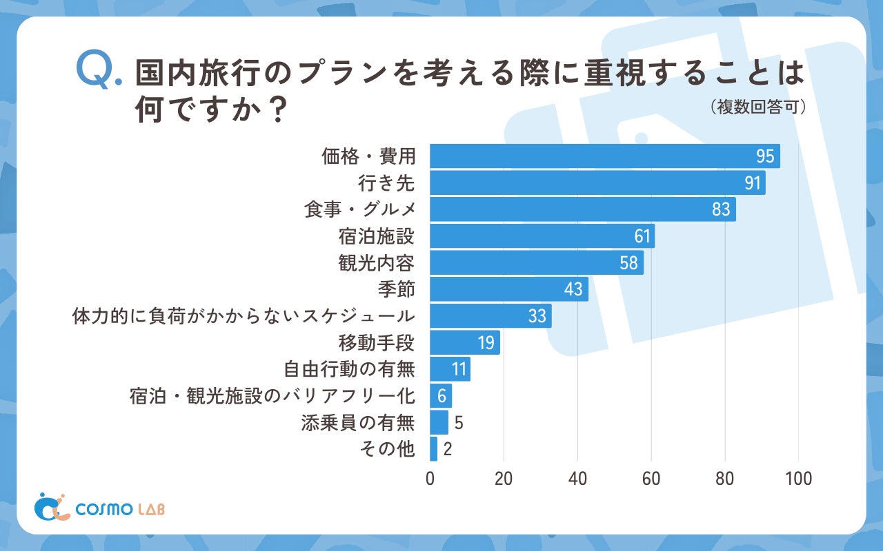 特筆すべきは滞在日数の傾向で、「1泊」(45.1%)と「日帰り」(23.6%)を合わせると約7割が短期間の旅行を選択しています。この背景には、体力面への配慮や日常生活との両立の必要性があると考えられます。旅行プラン選びでは「価格・費用」(66.0%)、「行き先」(63.2%)、「食事・グルメ」(57.6%)が重視され、コスト意識と質への要求が共存する様子が見て取れます。