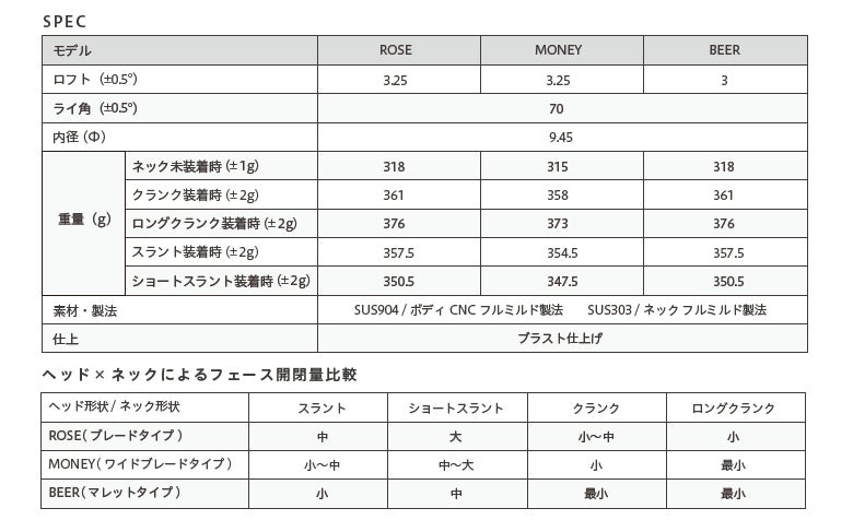 4 種類のネックと 3 種類のヘッド形状を自由に組み合わせ、あなたのストロークにパーフェクトフィット。高級腕時計にも採用される 904L ステンレス削り出しヘッドが、重厚で柔らかな打感と伸びのある転がりを実現します。