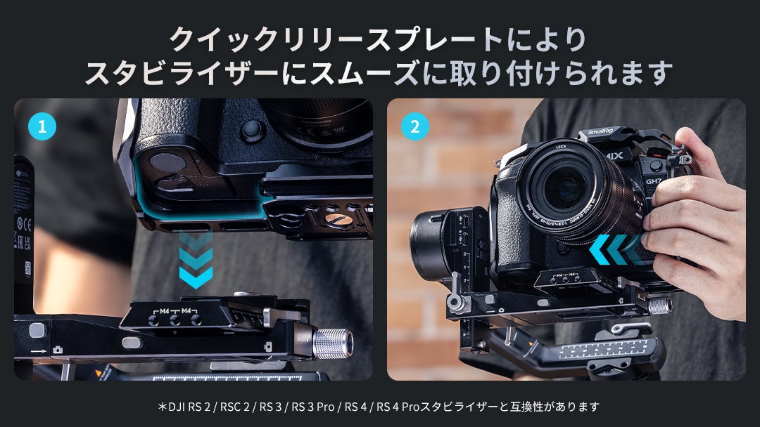 アルカスイス規格のクイックリリースプレートがケージ底部に組み込まれており、手持ち撮影、スタビライザー (DJI RS 2 / RSC 2 / RS 3 / RS 3 Pro / RS 4 / RS 4 Pro)、および三脚撮影を素早く切り替えることができます。