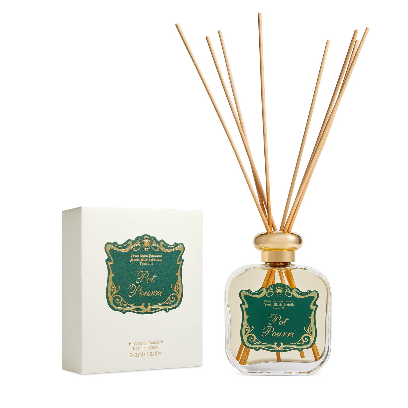 「ポプリ」は、サンタ・マリア・ノヴェッラの中でも最も古い調香のひとつで、1743年、「殿下の鋳造所の秘密」という写本の中で「白い衣服の間に置く香り」として紹介されています。その調合は、サンタ・マリア・ノヴェッラのドミニコ会修道士たちによって生み出され、バラ、カーネーション、シナモン、アイリスの根など、季節ごとにフィレンツェの丘で採れた植物が使われました。原料の植物はインプルネータ産のテラコッタ壺で丁寧に熟成されていたといいます。現在でもこの秘密のレシピはブランドによって厳重に守られており、トスカーナの風景を語る唯一無二の“香りの物語”として受け継がれています。