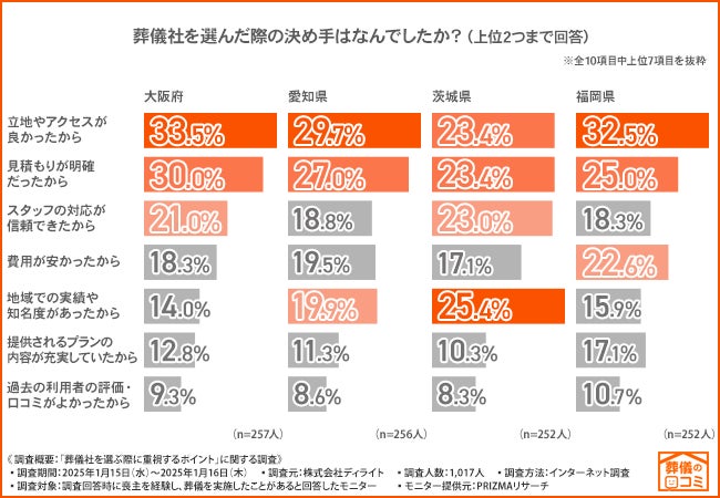 ・葬儀社選択の決め手は「立地やアクセスが良かったから」が多いものの、茨城県では「地域での実績や知名度があったから」が1位