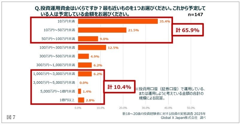18~20歳の投資経験者の投資運用資金については、まだ若年層ということもあり65.9%の人が100万円未満という結果でした。一方、既に1,000万円以上の資産を運用している層も10.4%ほどいました(図7)。