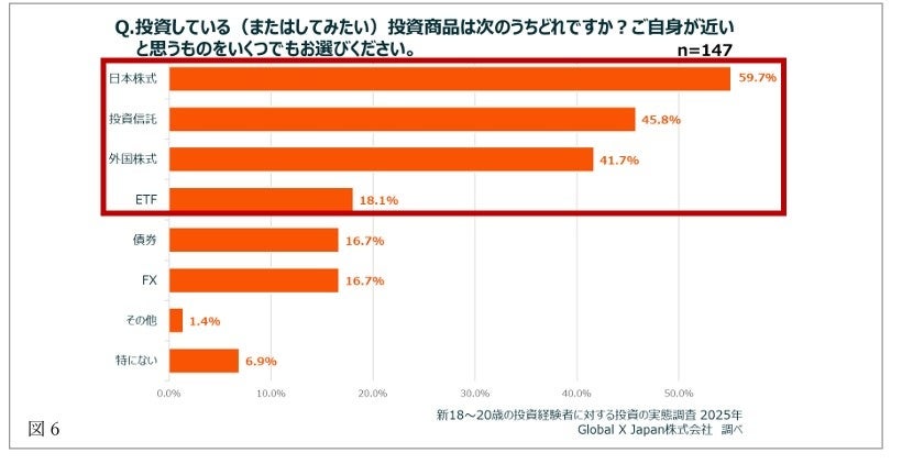 18~20歳の投資経験者の投資している(してみたい)商品の上位は、「日本株式」「投資信託」「外国株式」がランクインしました。また「ETF」は約2割の人が投資対象としていました(図6)。