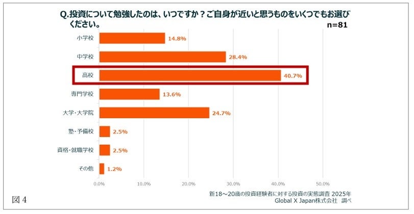 18~20歳の投資経験者の過半数の56.2%の人が、過去に学校の授業や課外学習等で、投資について勉強したことがあると回答しました。また投資について勉強したのは「高校」との回答が約4割と、最も多い結果となりました(図3)。