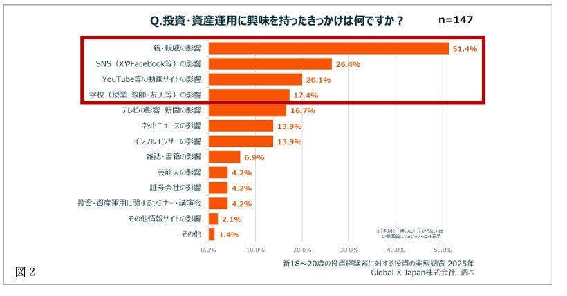 18~20歳の投資経験者が投資・資産運用に興味を持ったきっかけは、1位が「親・親戚の影響」となりました。また2位は「SNS(XやFacebook等)の影響」、3位は「YouTube等の動画サイトの影響」となり、若年層の情報収集トレンドを反映した結果となりました。また4位は「学校の影響」が挙げられており、2022年から高校で実施されている、金融教育の効果が出ていることが伺えました(図2)。