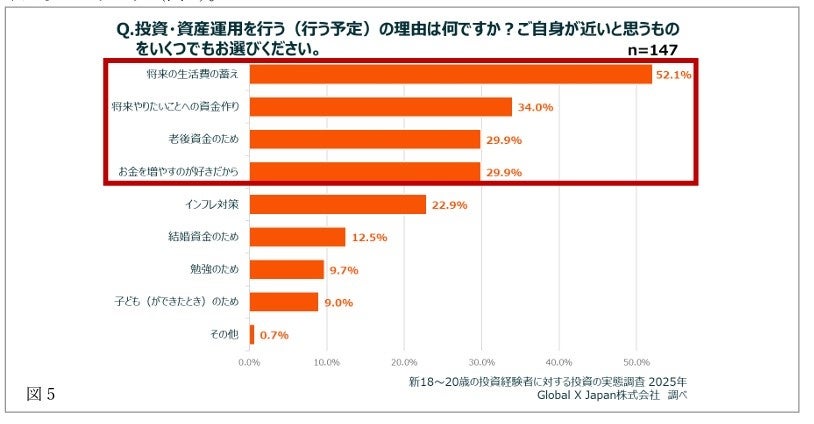 18~20歳の投資経験者に投資・資産運用をする理由を聞くと「将来の生活費の蓄え」、「将来やりたいことへの資金作り」、「老後資金のため」と、未来志向の理由が上位に入りました。一方、同率3位には「お金を増やすのが好きだから」がランクインするなど、趣味感覚で投資に取り組む層も少なくはないようです(図5)。