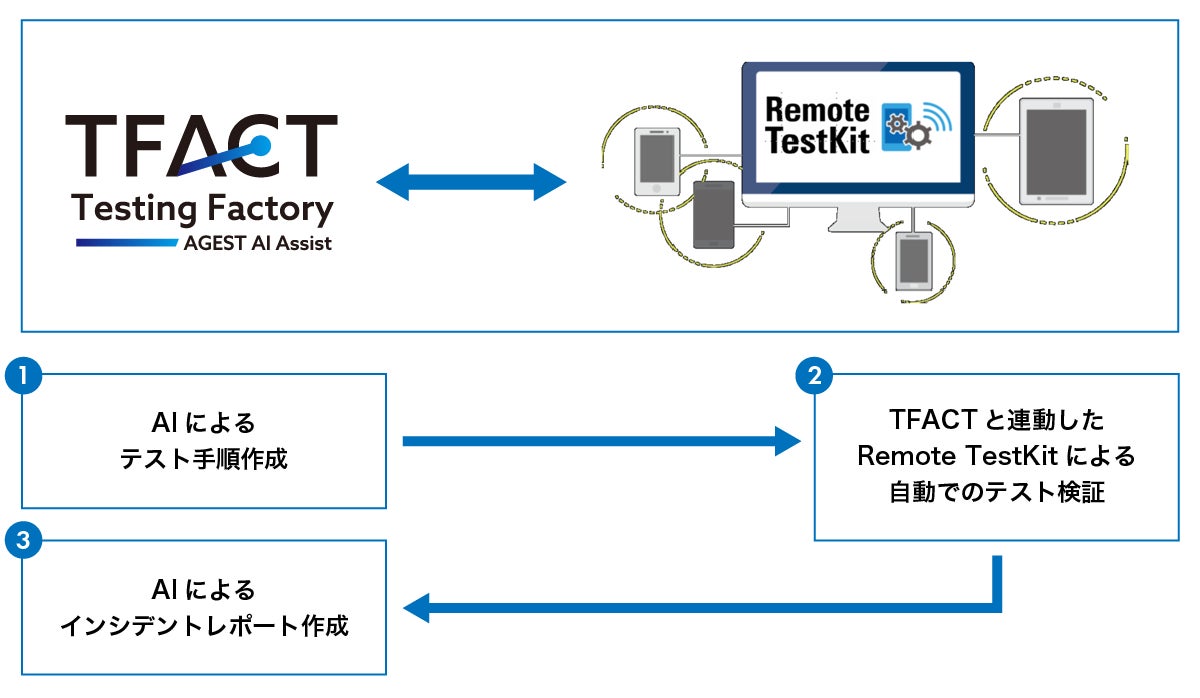 今回の取組みは、AGESTが展開しているAI機能を標準搭載したテスト管理ツール「TFACT」の次世代技術と「Remote TestKit」を連携させ、実機環境におけるテスト検証の大幅な効率化を目的としています。