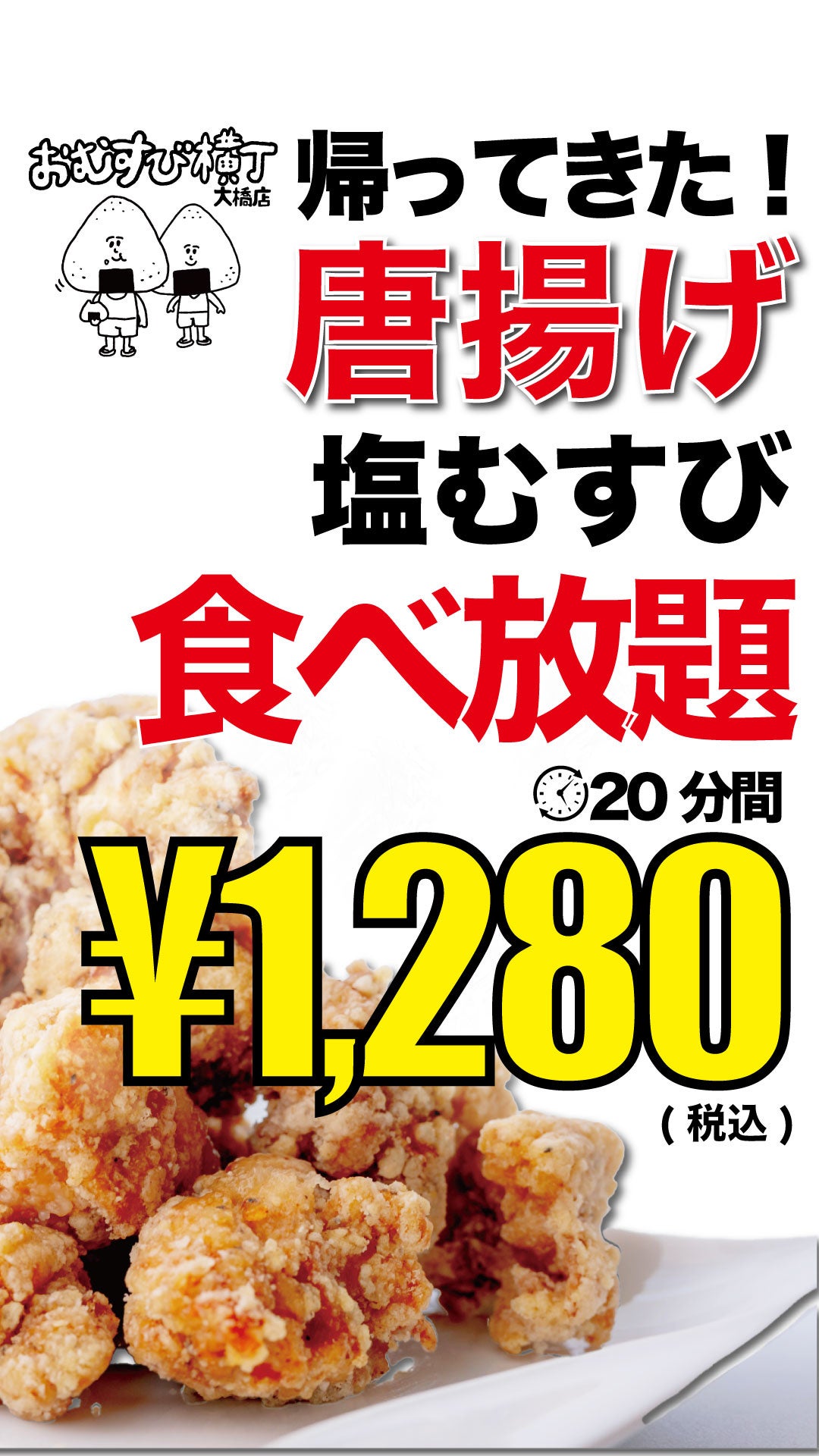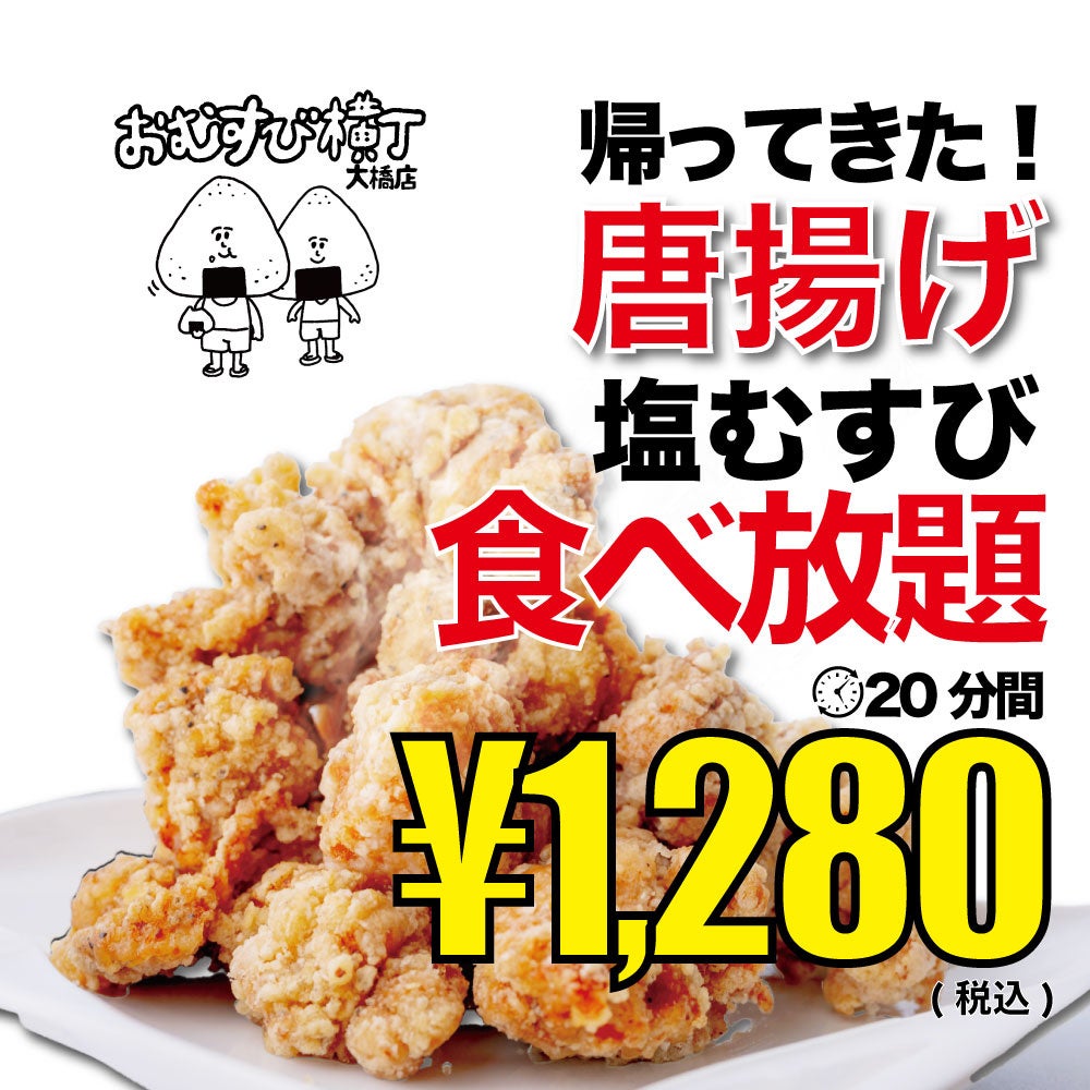 " 唐揚げ・塩むすび食べ放題 " ¥1,280(税込)