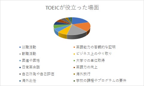 「当時、英語系のゼミに所属しておりました。そこでは点数の不出来にかかわらずTOEICの受験は必須になっており、単位の評価項目にも入っていたため上記項目の中では単位取得が役立っておりました。今後は転職活動に活かせるように現在勉強を進めております。」(20代・男性)