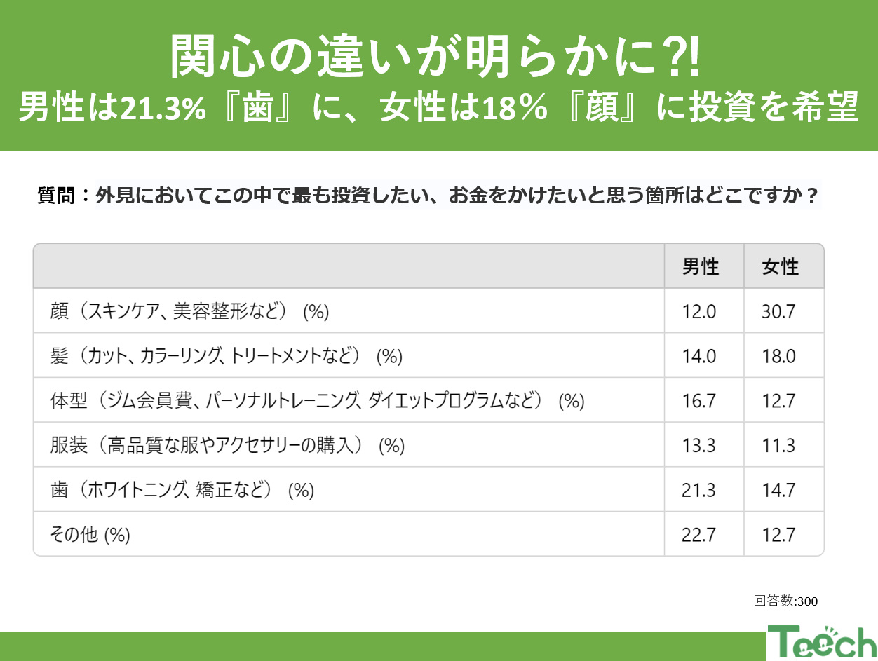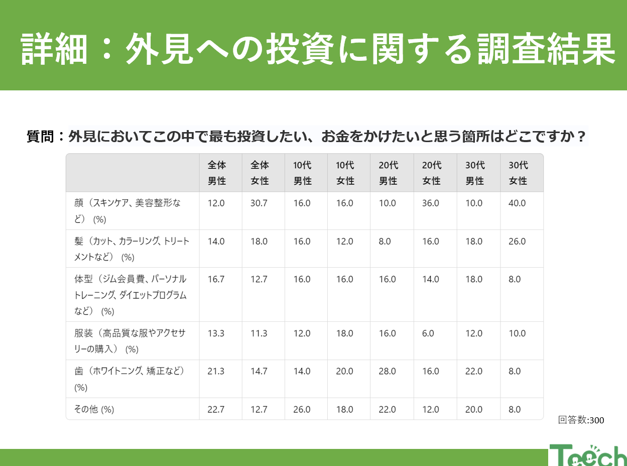 このアンケートでは、人々がどのような外見の要素に関心を持ち、どこに最もお金をかけたいと思っているのかを明らかにする結果となりました。外見は個人の印象や自信に大きな影響を与える要素であり、この調査結果から現代の美容トレンドや健康意識の高まりについての注目度もかいま見れます。、男女別および年代別の傾向を詳しく見ていきましょう。