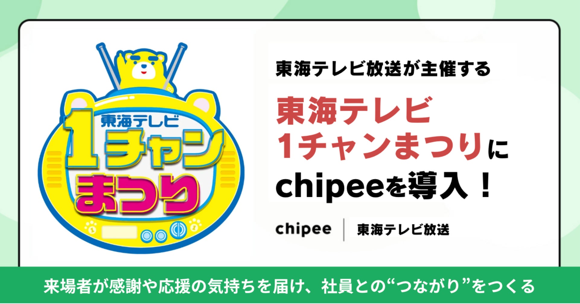 「こころとこころをつなぎ、世界を思いやりで満たす」をパーパスに掲げ、ウェルビーイング経営の実現を支援する株式会社チッピー(本社:東京都渋谷区、代表取締役:山崎令二郎)は、2025年10月25日(土)〜26日(日)に名古屋・栄の久屋大通公園(エンゼル広場・エディオン久屋広場)で開催される東海テレビ放送株式会社(本社:愛知県名古屋市、代表取締役社長:林泰敬)主催の「東海テレビ 1チャンまつり」において、来場者の“ありがとう”や“応援”の気持ちを可視化し、社員の働きがいを高める仕組み「Chipee(チッピー)」の導入が決定しました。