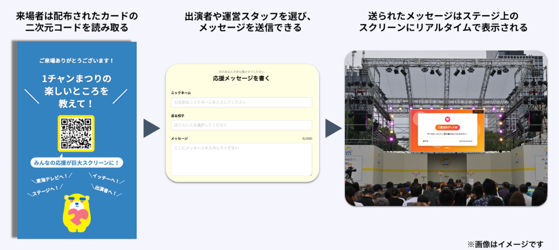 来場者は会場で配布される二次元コード付きの「サンキューカード※」からアクセスし、社員や出演者への感謝や応援のメッセージを送ることができます。送られたメッセージはステージ上の大型スクリーンやイベント特設ホームページ( https://www.tokai-tv.com/1chfes/ )に表示され、社員が来場者の想いを受け取ることができます。