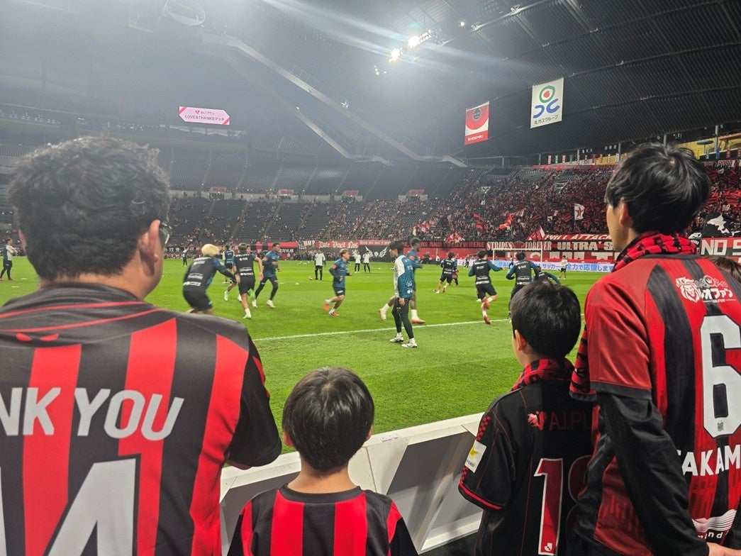 そして、いよいよプログラムのハイライトの一つ、憧れのピッチサイドへ。普段はテレビから遠くに見ていた、鮮やかな緑の芝生が目の前に広がります。これから始まる激闘に備え、選手たちがウォーミングアップを開始すると、スタジアムの空気は一変。子どもたちは、わずか数メートルの距離で繰り広げられる光景に釘付けになりました。