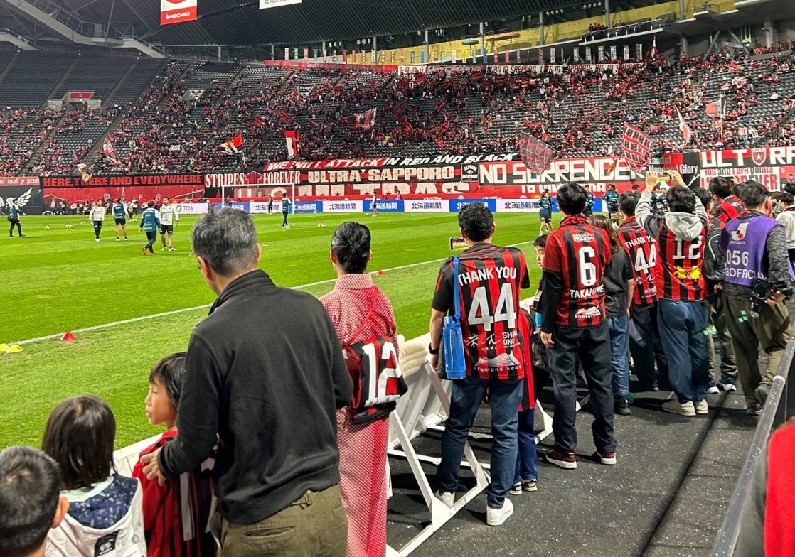 コンサドーレの選手のナイスプレーには歓声が上がり、数万人のサポーターとスタジアムが一体となる応援の熱気を全身で浴びていました。