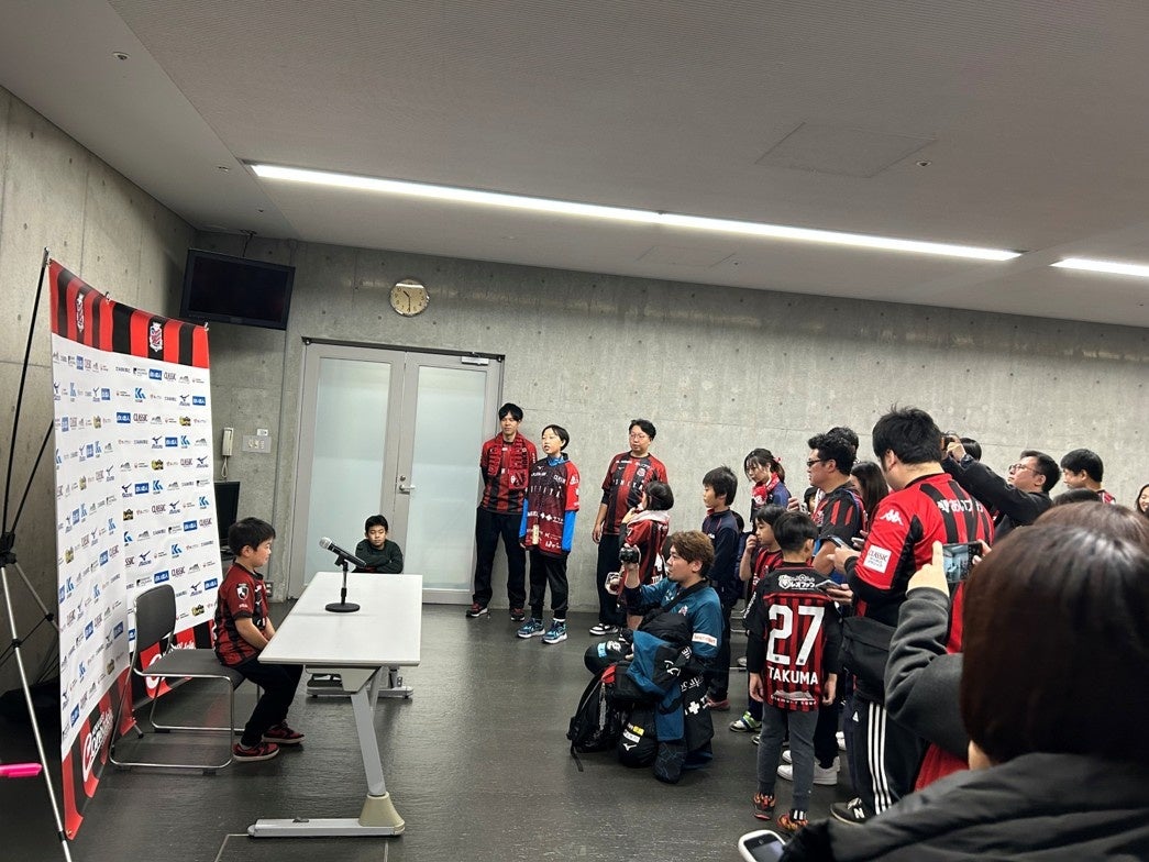 続いて、試合後のヒーローインタビューや記者会見が行われる会見場へ。監督や選手が座る席に実際に腰掛け、未来のスター選手になった気分で記念撮影を楽しみました。