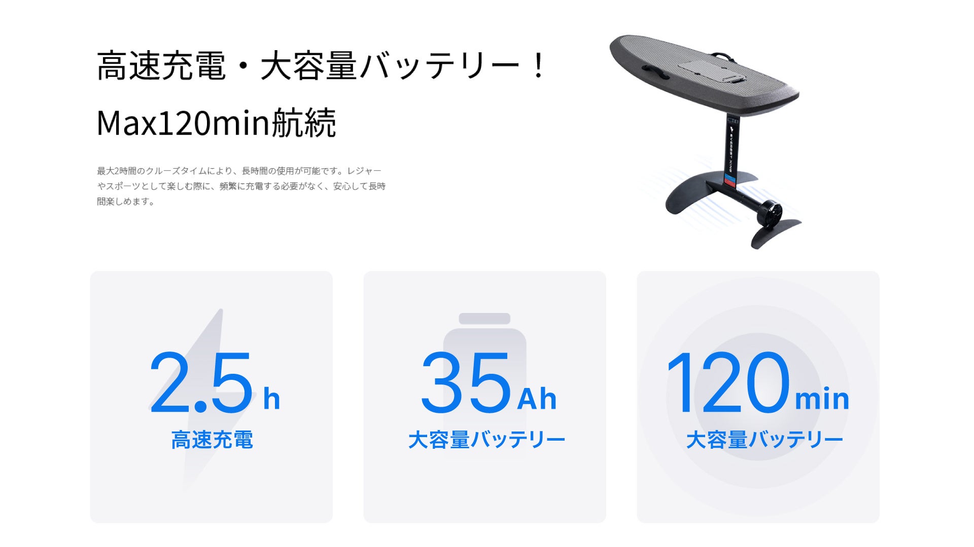 取り外し可能なリチウムイオンバッテリーを搭載し、ジェット推進システムを採用するEVEREST XINGシリーズは、クリーンで静かです。大容量バッテリーを搭載し、フル充電で最大120分の航行が可能となり、なお日本仕様は出力を1.5kW未満にすることで、免許も船舶検査も不要に。誰でも気軽に楽しめます。