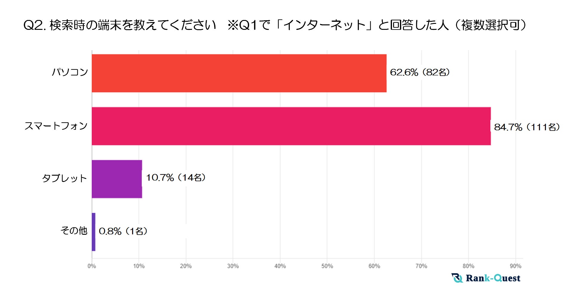 最も多く利用されている検索端末は「スマートフォン」で、全体の84.7%が使用している結果となりました。次いで「パソコン」が62.6%と根強い支持を集めています。
