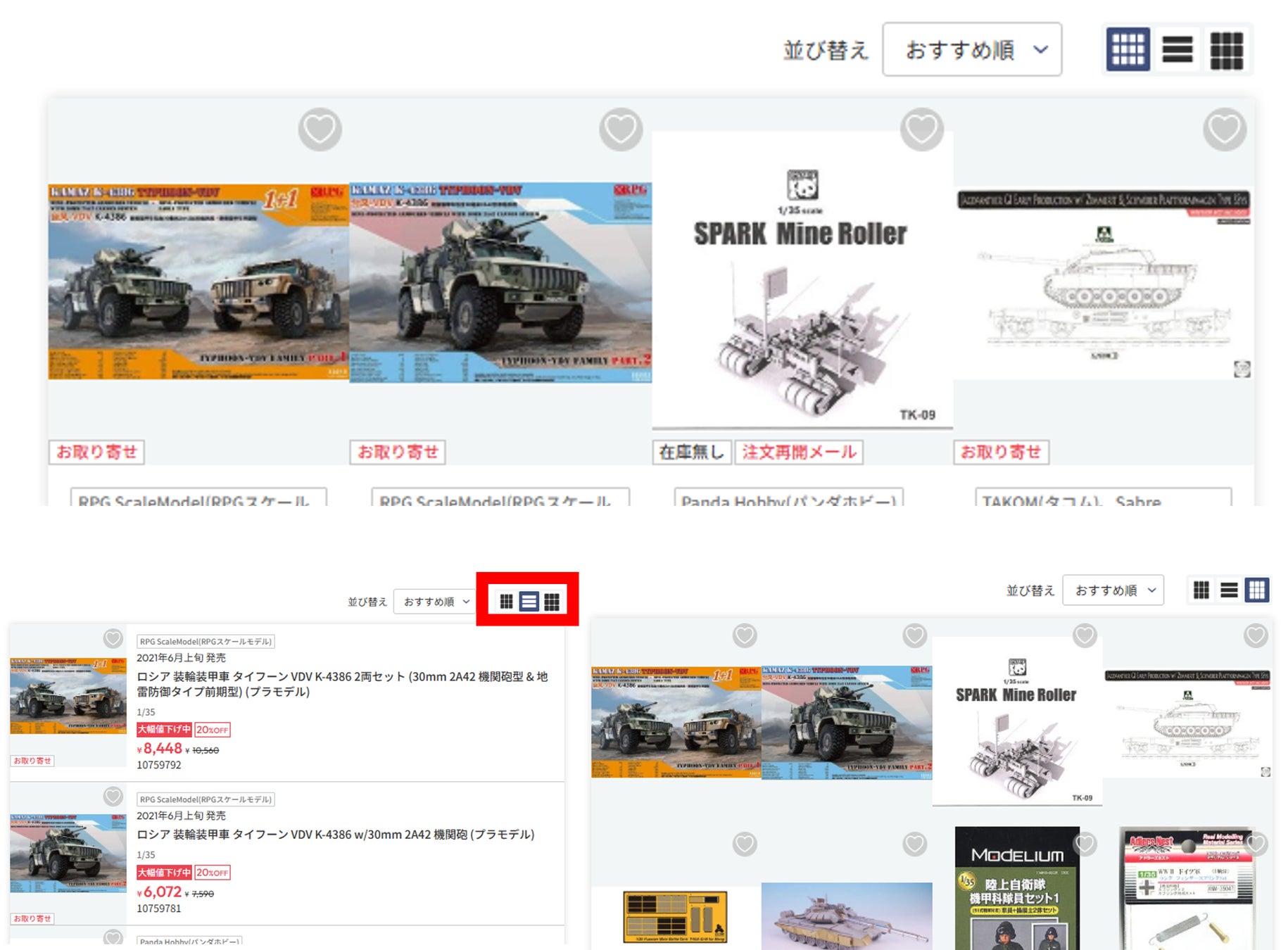 リストの表示方法を通常、1カラム、画像のみの3パターンで切り替えるようにしました。