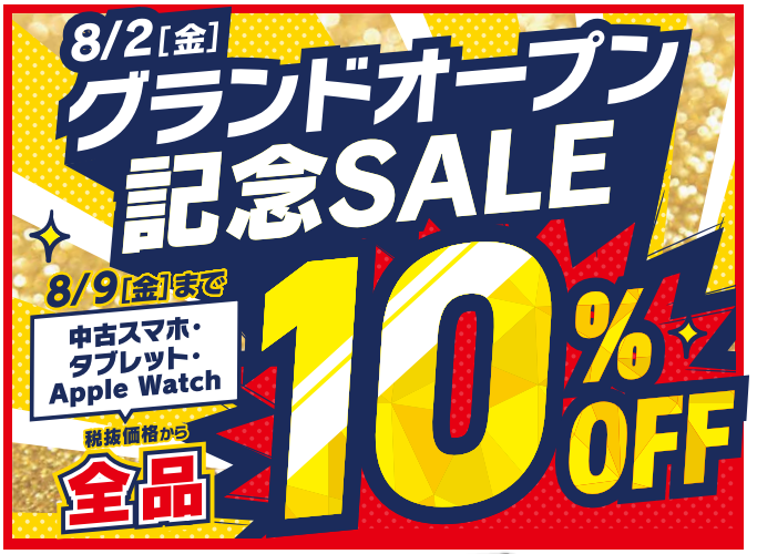 実施内容 :中古スマホ・タブレット・Apple Watchなど税抜価格から全品10%割引