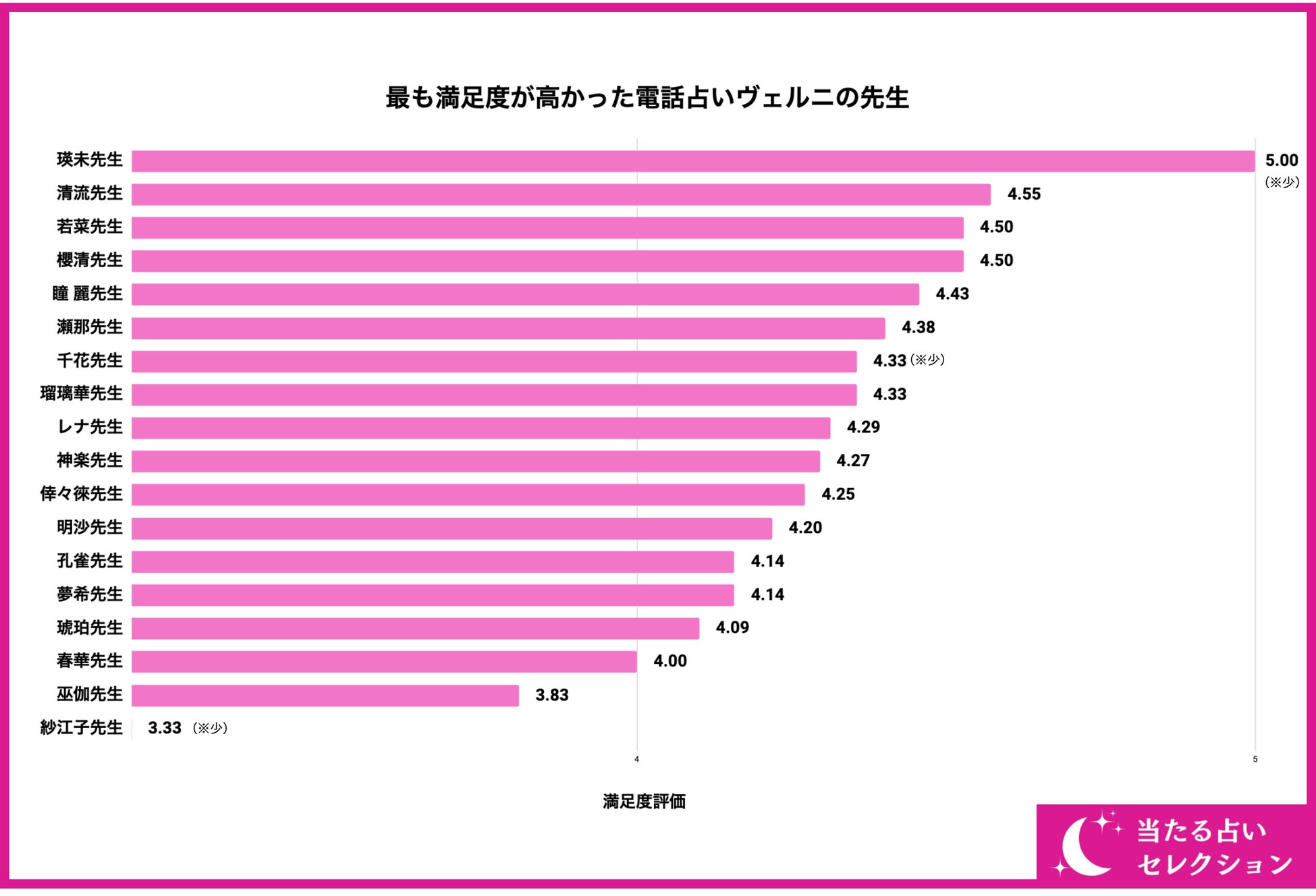 続いて、電話占いヴェルニの先生の中で最も満足度評価が高かったのはどの先生なのでしょうか?結論から言うと、画像の通り『瑛未先生』が満足度評価「5.00/5.00」で最も評価が高いことが分かりました。全体的にヴェルニ自体の占い師は低評価が少なく、多くの方が満足していることが分かりました。第2位は『清流先生』、第3位には『若菜先生』と続いています。