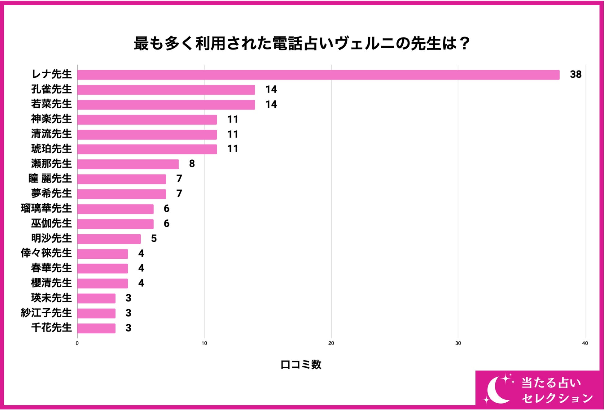 続いて、159名の利用者のうち最も多く利用された電話占いヴェルニの先生をご紹介していきます。結論から言うと、『レナ先生』や『孔雀先生』、『若菜先生』といった有名な先生が上位となりました。やはり人気の先生は色々な記事や特集で見ることも多く、認知度や知名度が高いため利用者数も多くなっています。さらに、口コミに関しても高評価が多いため、そこからさらにお客さんが集まってくるサイクルになっていると考えられます。