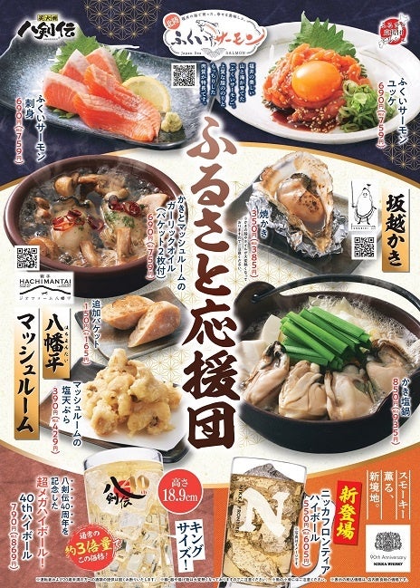 今回の「ふるさと応援団マルシェ」では、ふくいサーモン・坂越かき・八幡平マッシュルームをたっぷり使用したメニューを八剣伝にて10月10日(木)より期間限定で提供いたします。