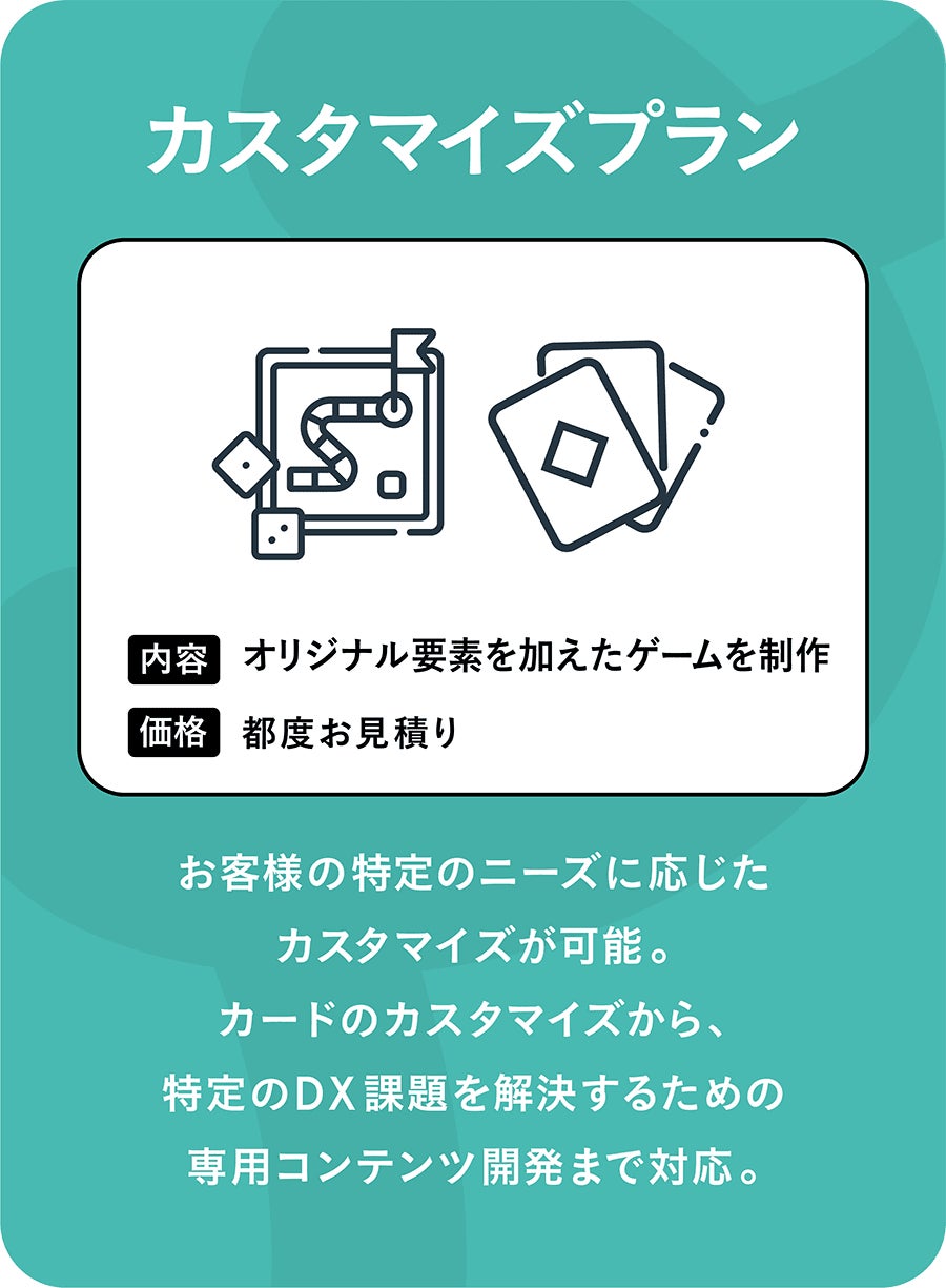 ニーズに応じて、ゲームをカスタマイズして提供するプランです。自社オリジナルの要素を加えることで、より実務に近いディティールを表現できるほか、特定のニーズにフォーカスしたゲーム体験の提供が可能となります。