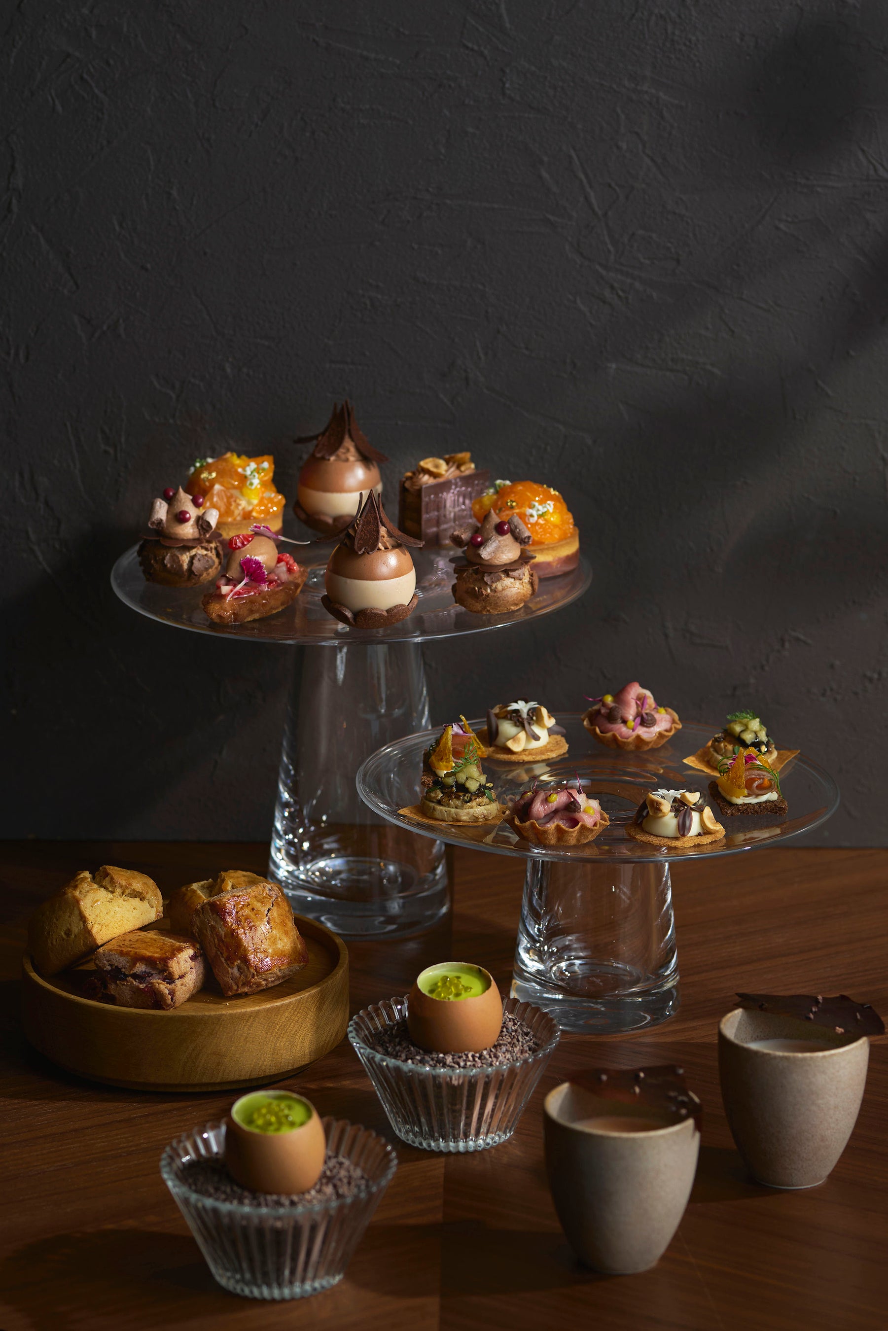チョコレートの魅力をより豊かにご堪能していただけるひとときとして、パティーナ大阪19階のティーラウンジ「にじり」では、カカオの魅力を多彩に表現したアフタヌーンティーをご提供しています。セイボリーにはカカオのほのかな苦みや香ばしさを重ね、スイーツには果実やナッツを合わせることで、奥行きのある味わいを引き出しました。バレンタインシーズンにもふさわしい、お茶とチョコレートが織りなす繊細なハーモニーを、大阪城公園のパノラマビューとともにお楽しみください。
