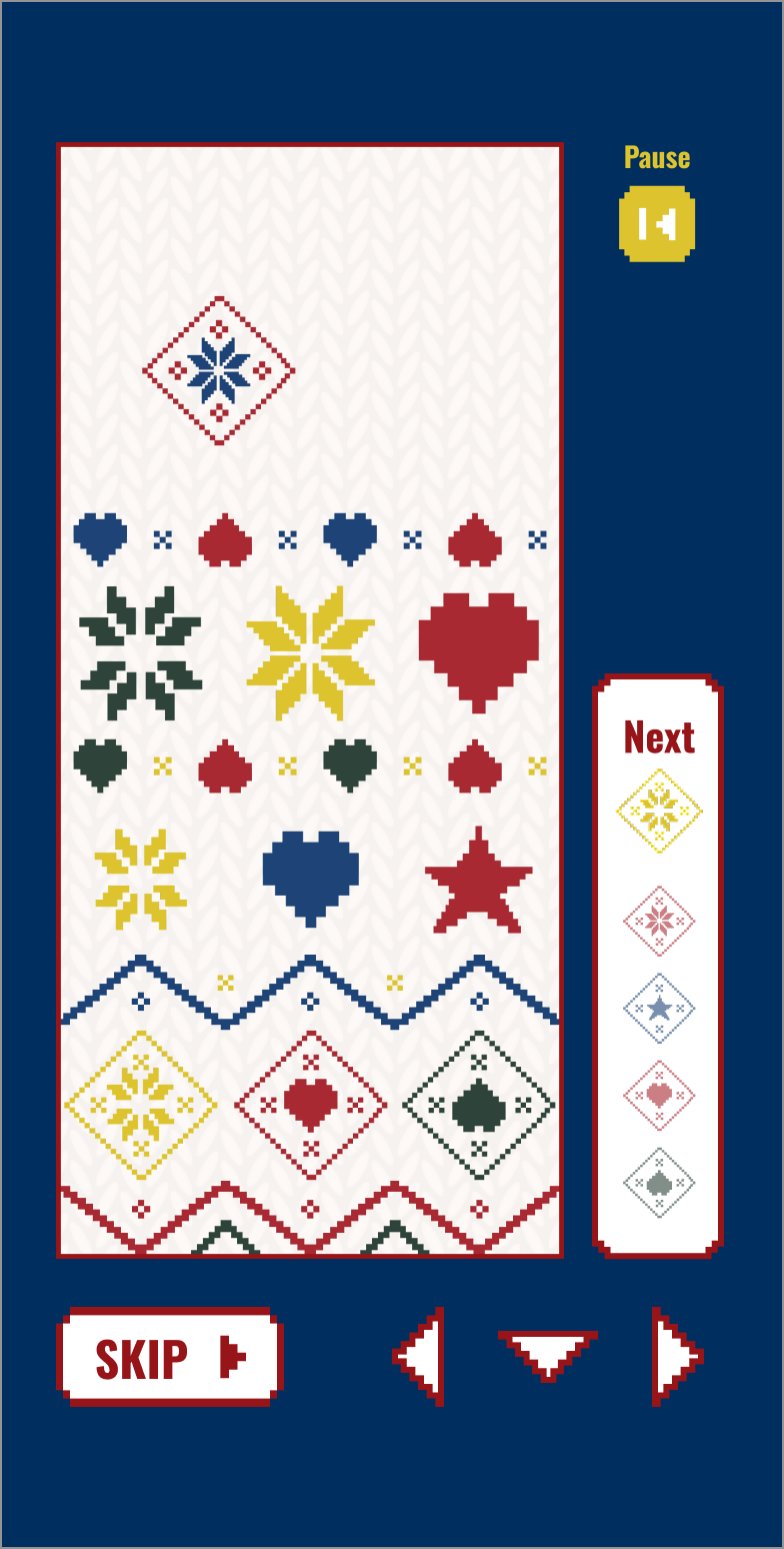 画面上から落ちてくるノルディック柄アイコンを左右に動かし、好きな配置に並べてデザイン。