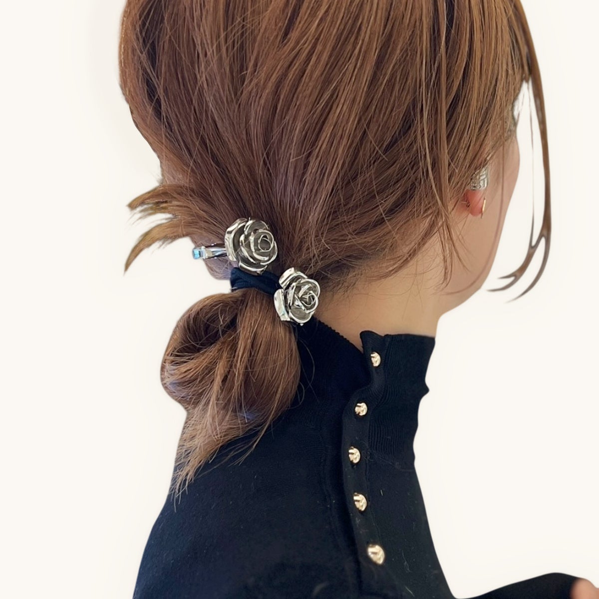 ローズ メタル ポニーは、ソリッドなメタルの輝きとシックなモノトーンで、薔薇のイメージをモダンかつクールにアレンジした独自のデザインです。立体的なオーナメントはさらりと結ぶだけで確かな存在感が。シンプルな単品使いも素敵ですが、色違いでの重ね付けや、同シリーズの他アイテムとのコーディネイト、またシニヨンをラッピングするアレンジもおすすめ。ジュエリー風のモチーフは手首にブレスレット風に着けても楽しめ、ギフトにも最適です。