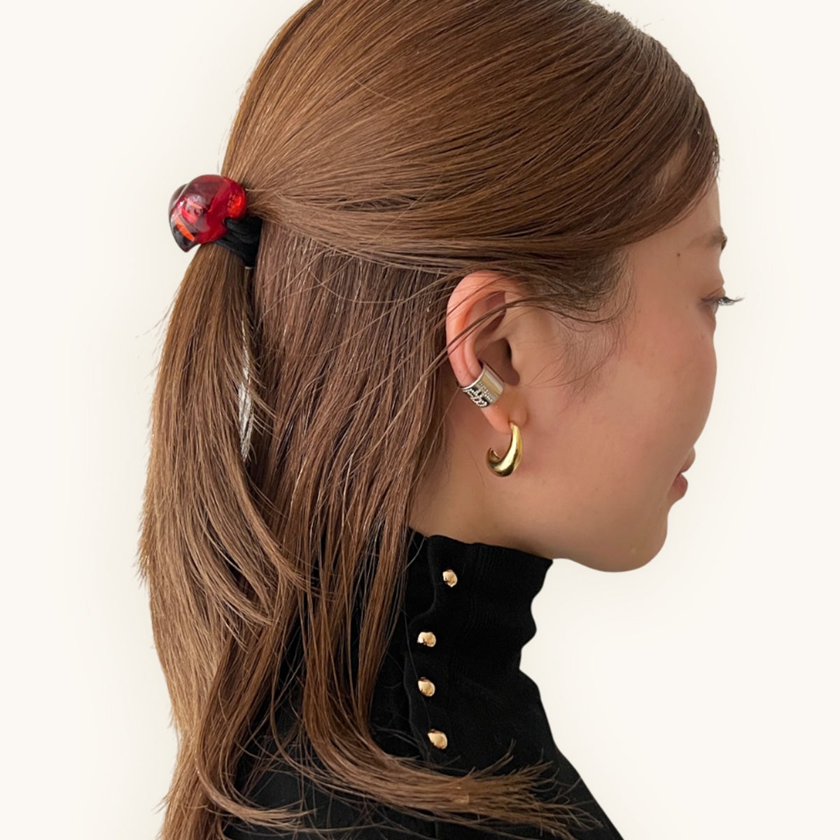 <THE HAIR BAR TOKYO>ローンチ以来、ブランドのシグネチャーデザインとも言える、ハンドドローイングのハートポニー。磨き上げられた曲面と艶はアクリル素材とは思えない仕上がり。黒曜石を思わせる艶をもつBLACKと、アンバー風のREDの2色展開。どちらの色も深く、抜け目がない分、それぞれの「LOVE」はサイズで表現してみてはいかがでしょうか?普遍的なテーマをモダンにアップデートしたハートのデザインで、この季節に大人の遊び心をお届けします。ラージサイズはその圧倒的な存在感が特徴ですが、色違いやサイズ違いのお揃いでレイヤードすれば、アレンジの幅は様々。スモールをブレスレット使いにして、ヘアアクセとのコーディネートを楽しむこともお勧めです。