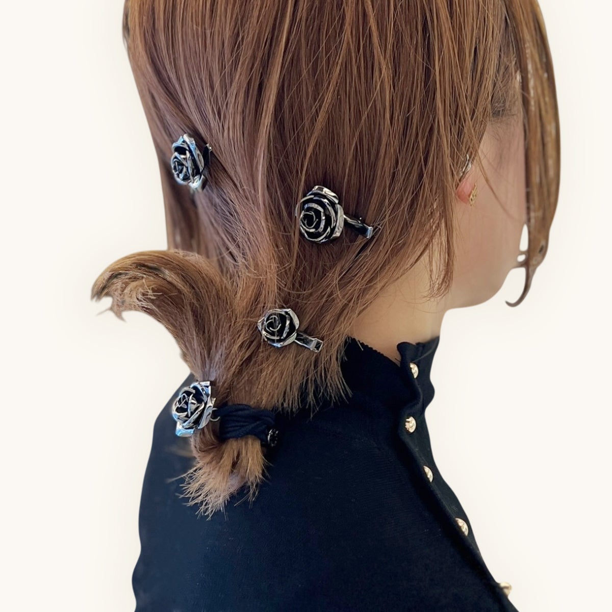 薔薇をモチーフにしたボビーピンセット。ベースにはホールド力にすぐれたスチールピンを使用し、機能性も兼ね備えたアイテムです。ローズのオーナメントのサイズがそれぞれに違い、単品、重ね付けと多様なアレンジが可能です。ピンの土台部分を髪に埋めるように差し込めばオーナメントの美しさがいっそう際立ち、より上級な装いも楽しむことができます。