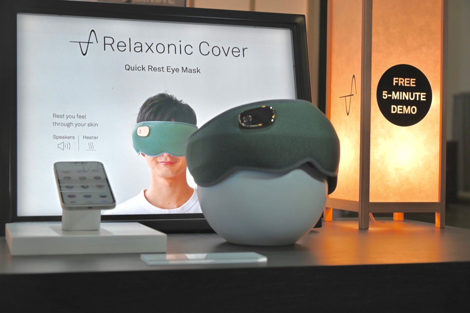 超高周波・温熱機能を搭載したスピード休息アイマスク「Relaxonic Cover(リラソニックカバー)」の体験も提供。超高周波「ハイパーソニック」と温熱機能による、目元と耳から深いリラックス感をもたらす質の高い休憩をご体感いただけます。 -