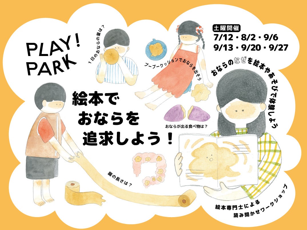 未知との出会いがコンセプト、子どもが自由な発想で遊べる屋内キッズパーク「PLAY! PARK」の企画・運営を行う、エイアンドビーホールディングス株式会社(本社:東京都目黒区、社長:野田 純)は、絵本に関する高い知識や、読み聞かせ技術を備えた絵本専門士に協力いただき、ユーモラスで楽しいワークショップ「絵本でおならを追求しよう!」を、2025年7〜9月の指定日(計6日間)に実施します。