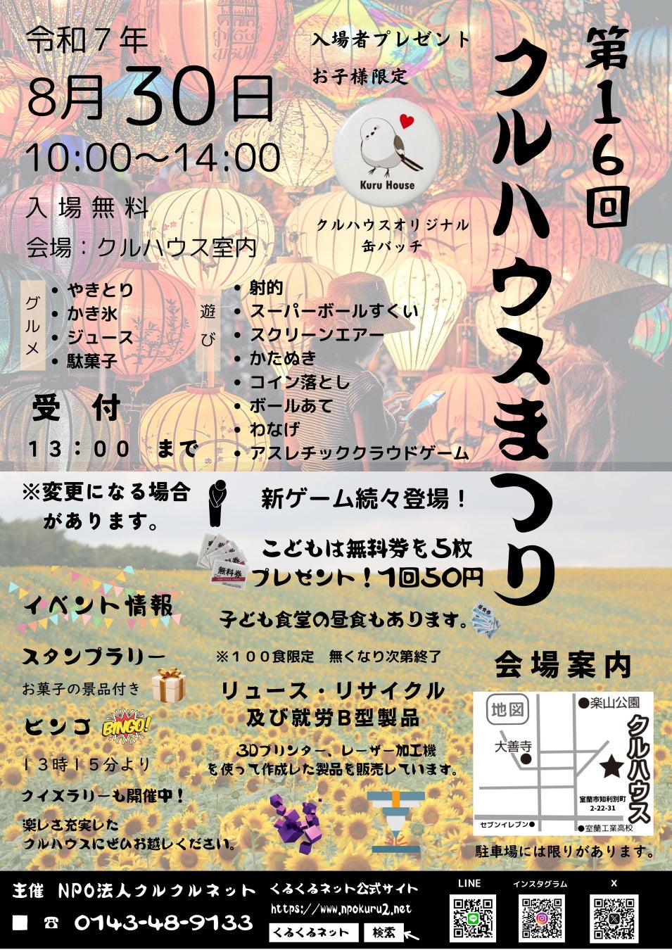 NPO法人くるくるネット(北海道室蘭市知利別町/代表:鳥山晃)は、地域の子どもたちの健やかな育ちと居場所づくりを目的とした恒例イベント「第16回 クルハウスまつり」を、2025年8月30日(金)10:00〜14:00に開催いたします。