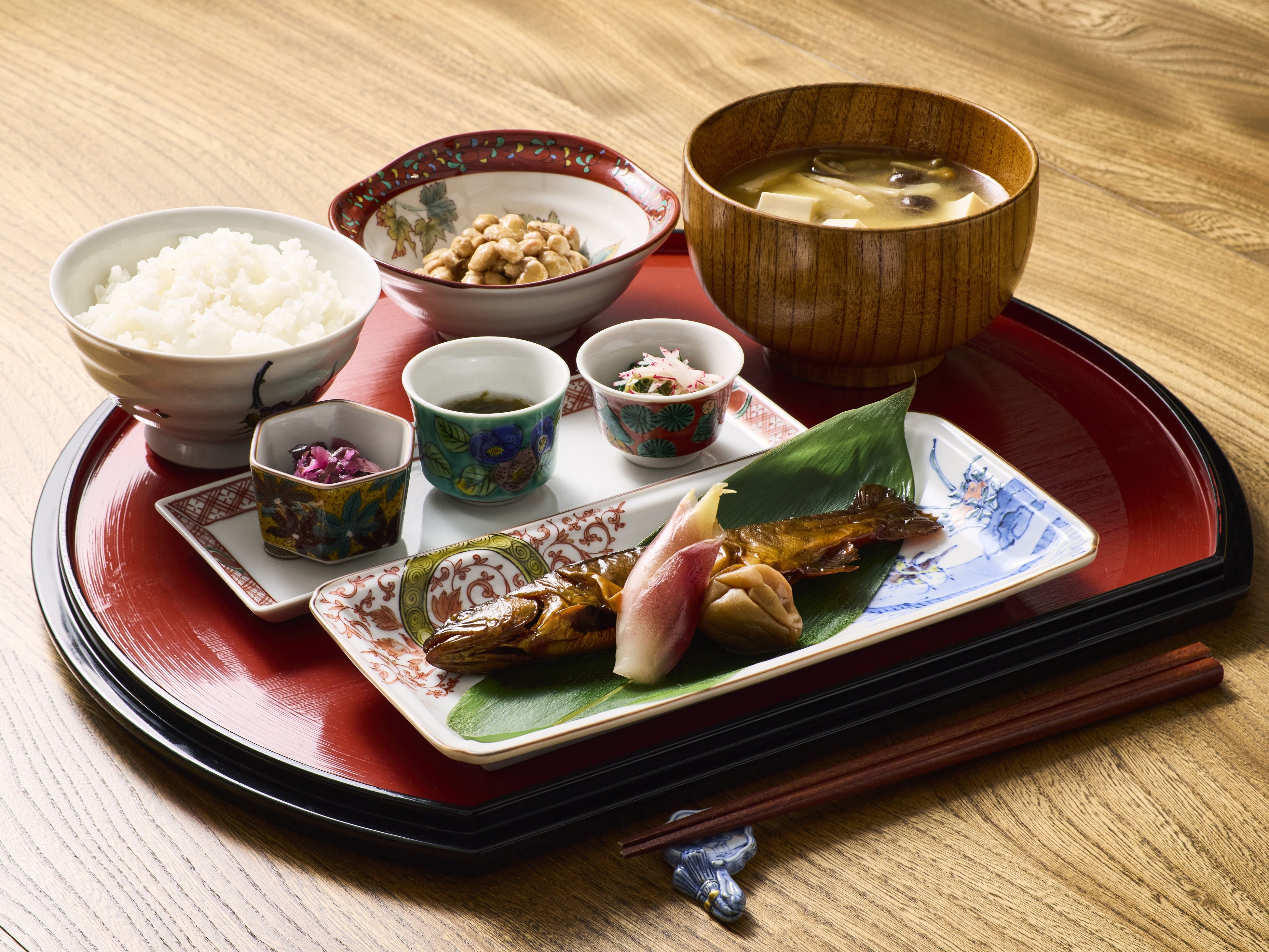 岩魚の甘露煮を中心に、炊き立てのご飯や味噌汁、納豆、小鉢を彩り豊かに揃えた、1日のはじまりに寄り添う朝食です。岩魚は、料理長が白山麓に足を運び、一尾ずつ状態を見極めて厳選し、古民家の懐かしい情景に合う甘露煮に仕立てています。