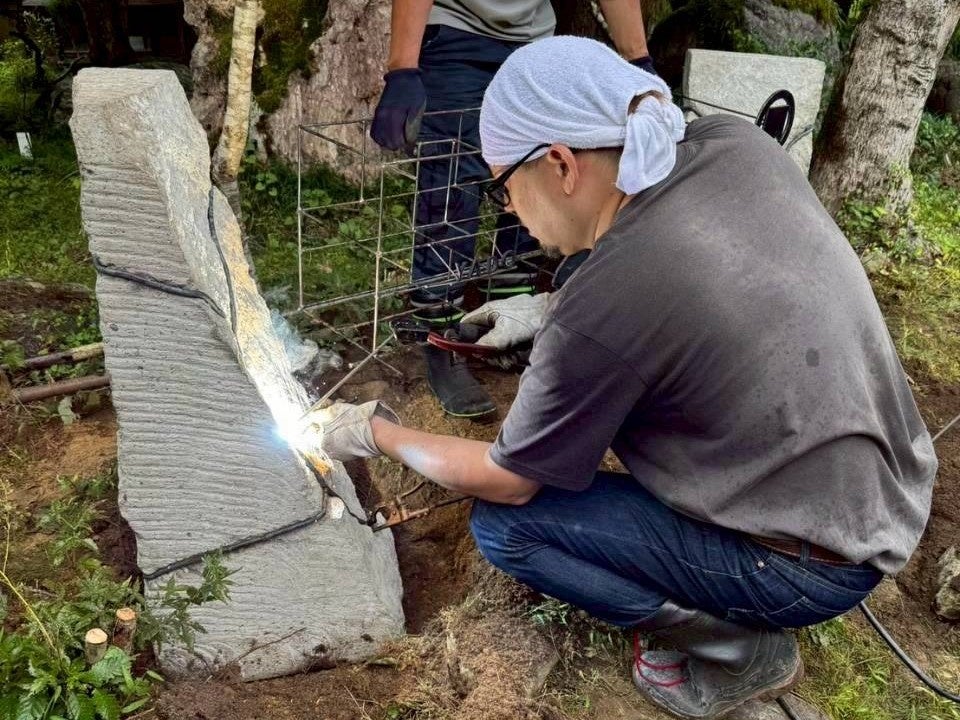 制作は、まず存在感ある石と鉄造形の“相性”を探るところから始まりました。
